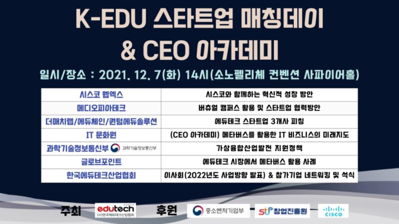 한국에듀테크산업협회에서 주최하는 ’K-EDU 스타트업 매칭데이 & CEO 아카데미’가 오는 12월 07일 화요일 14일에 진행된다. 온·오프라인으로 진행되는 이번 행사는 에듀테크 기업들의 기술, 제품 및 서비스를 주제로 진행될 예정이다. 프로그램은 ▲시스코와 함께하는 혁신적 성장 방안 ▲버츄얼 캠퍼스 활용 및 스타트업 협력 방안 등의 주제로 하는 세미나 ▲스타트업 3개사 피칭 ▲인사말 ▲ CEO 아카데미 기조 강연 등으로 구성된다. 에듀테크 제품 및 서비스에 관심 있는 누구나 참여할 수 있다. 해당 웨비나에 대한 자세한 내용 확인과 참가 신청은 여기에서 할 수 있다.