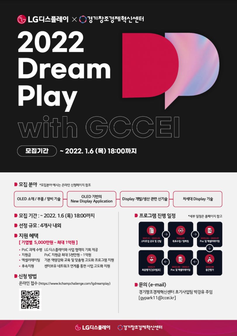 경기창조경제혁신센터(센터장 신현삼, 이하 ‘경기혁신센터’)는 LG디스플레이와의 협업 기회가 주어지는 ‘2022 Dream Play with GCCEI’ 참여기업을 모집한다.