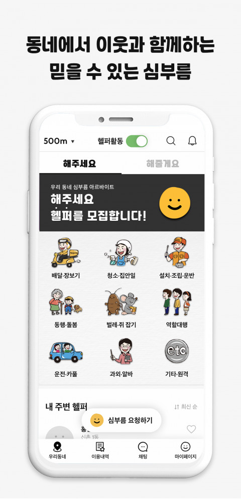 해주세요에서는 사용자 인근을 중심으로 주변 ‘헬퍼’들에게 원하는 심부름을 요청할 수 있다. 또 헬퍼 등록을 통해 이웃 심부름을 수행해주고 비용을 받을 수도 있다.