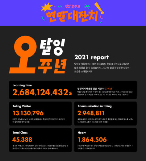 이와 함께 탈잉은 연말을 기념한 역대급 할인을 제공하는 ‘2021 연말대잔치’ 프로모션으로 실시한다고 10일 전했다. 탈잉의 연말대잔치는 연중 역대급 할인 혜택을 제공하는 프로모션이다. 한 해 동안 사랑받은 클래스를 선정해 공개하고 튜터에게 감사의 마음을 전하는 대규모 시상식으로 올해로 4회 차를 맞았다. 더욱이 올해는 탈잉의 창립 5주년으로 그동안의 다양한 성과와 흥미로운 기록을 함께 공개했다.
