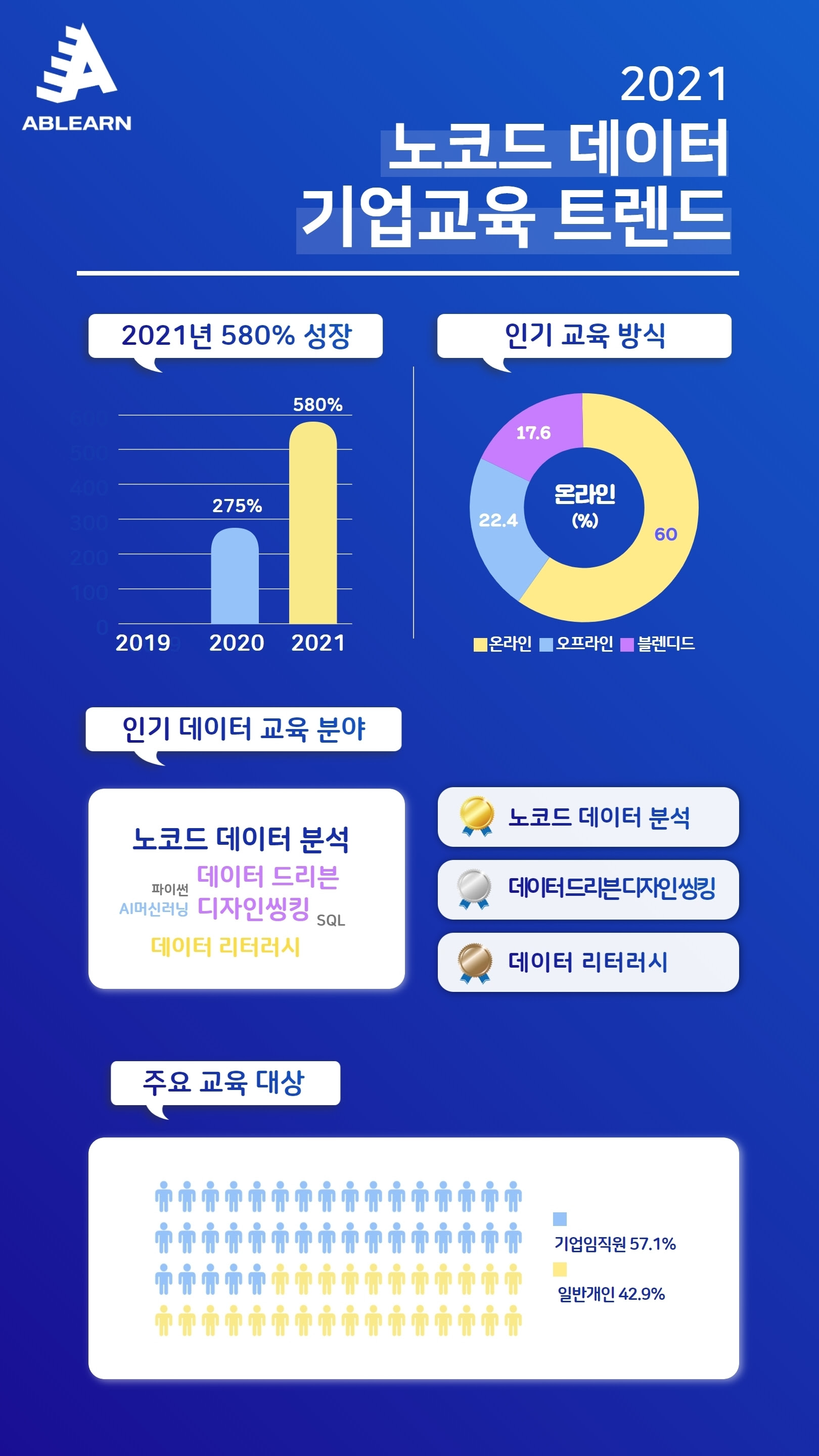 비전공자들을 위한 노코드 데이터 활용교육 전문 기업 에이블런(대표 박진아)가 2021년 노코드 데이터 기업교육 트렌드를 발표했다.