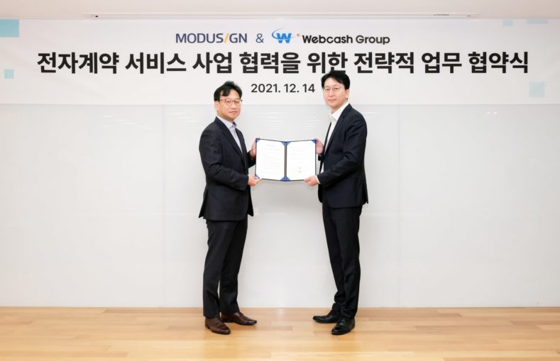 B2B SaaS 전자계약 서비스 기업 모두싸인(대표 이영준)이 B2B 핀테크 기업 웹케시그룹(회장 석창규)과 전략적 업무제휴를 맺고 웹케시그룹 솔루션에 전자계약 서비스를 탑재한다고 밝혔다.