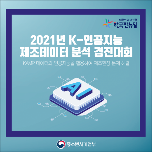 중소벤처기업부(장관 권칠승, 이하 중기부)는 인공지능 중소벤처 제조 플랫폼(이하 KAMP) 데이터를 활용, 중소 제조 현장의 고민을 해결하는 ‘제1회 케이(K)-인공지능 제조데이터 경진대회’의 수상팀 8개를 지난 16일 최종 선정했다고 밝혔다.
