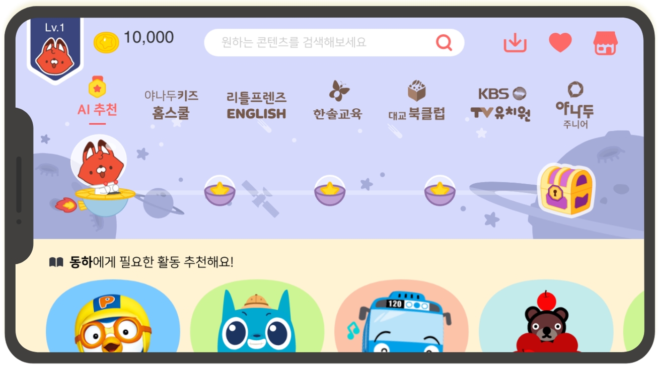특히 어린이집, 유치원 필수 교육인 누리과정 5개 항목(신체운동건강, 의사소통, 사회관계, 예술경험, 자연탐구)관련 콘텐츠가 모두 포함돼 있어 엄마들이 미취학 자녀와 함께 집에서 재미있게 놀이하며, 공부하는 홈스쿨링 도우미로도 활용할 수 있다. 아이의 장래희망과 선호하는 콘텐츠를 기반으로 AI 분석을 통해 유아 사용자에 맞는 학습 콘텐츠를 추천한다.