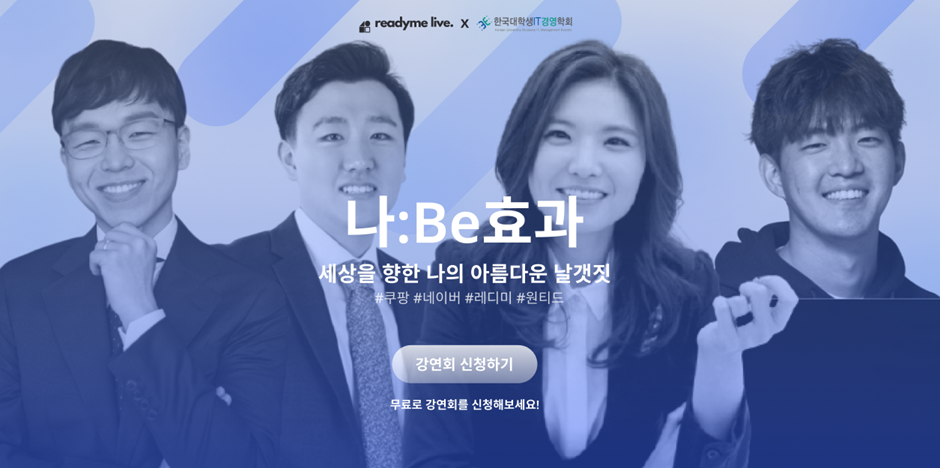 청년들을 위한 강연 ‘나:Be 효과’는 한국대학생IT경영학회(KUSITMS)와 팀메모리(레디미)가 함께 준비했다. 한국대학생IT경영학회는, 기획자・개발자・디자이너가 한데 모여 IT 서비스를 고민하는 대학 연합 학회로 매 기수 70~80 명의 대학생들이 참여한다.