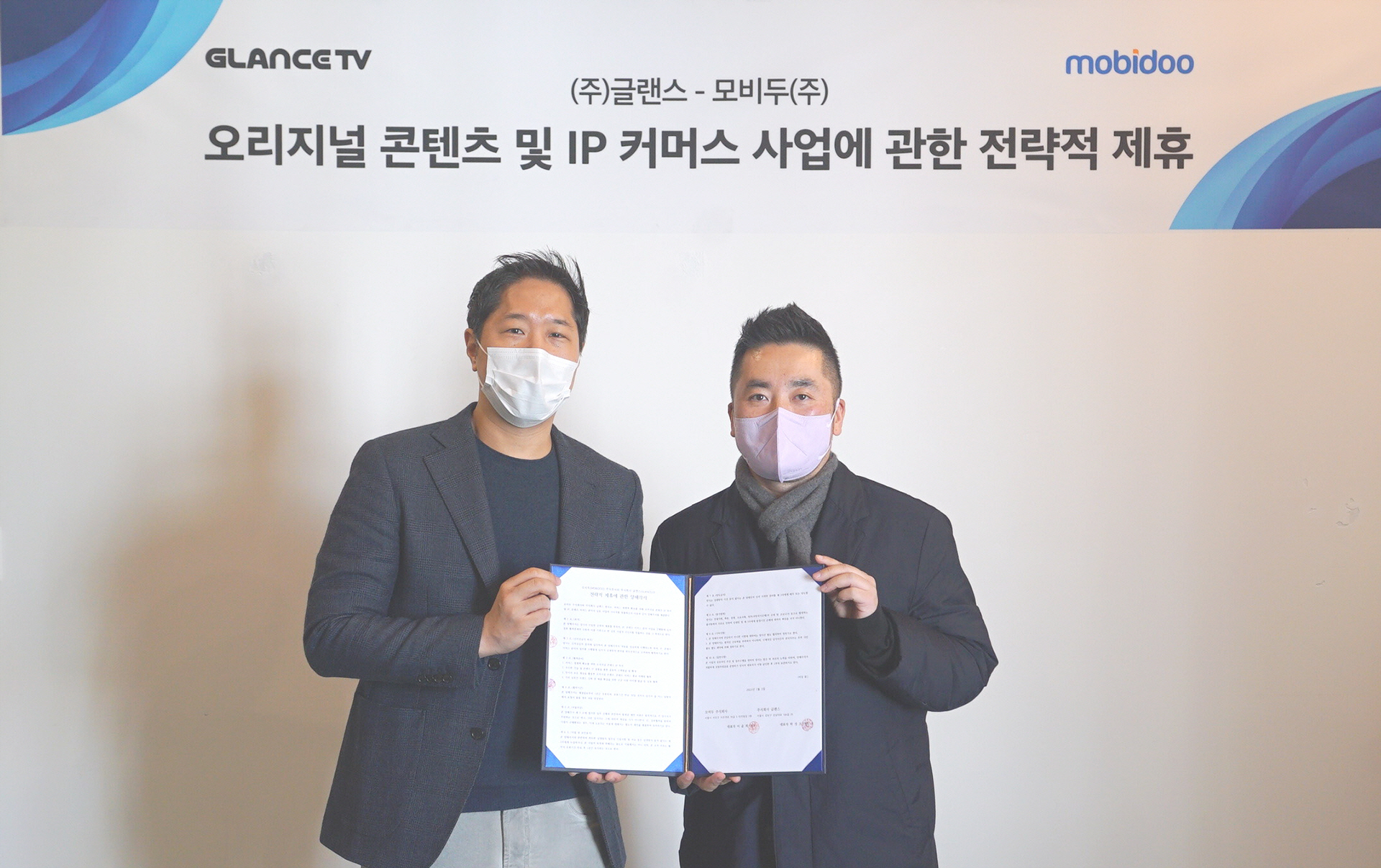 디지털 콘텐츠 스튜디오 글랜스TV는, 지난 1월 3일 서울 역삼동 글랜스TV 사옥에서 소스플렉스로 잘 알려진 라이브 커머스 솔루션 전문 기업 모비두와 오리지널 콘텐츠 투자 및 IP 커머스 사업에 관한 전략적 제휴를 체결했다고 밝혔다.