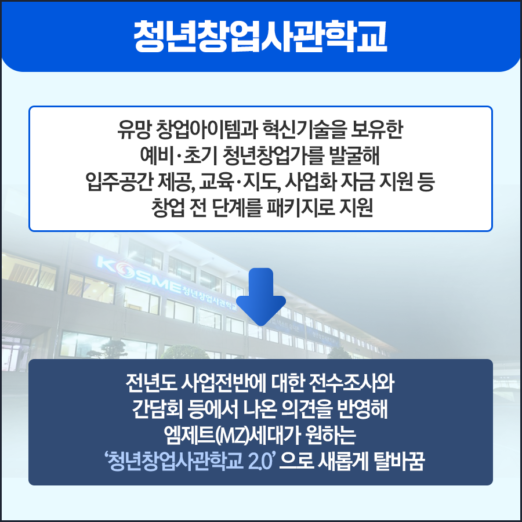 올해 청년창업사관학교는 전년도 사업전반에 대한 전수조사와 청년 창업자 간담회 등에서 나온 의견을 반영해 엠제트(MZ)세대가 원하는 청년창업사관학교 2.0으로 새롭게 탈바꿈할 계획이다. 새로운 청년창업사관학교는 엠제트(MZ)세대 흐름(트렌드)에 민감하게 반응하는 민간이 주도해 우수창업자를 유치·육성 여건한다.