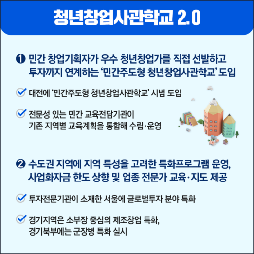 먼저 민간 창업기반(인프라)가 열악한 비수도권 우수창업자를 위해서 대전에 ’민간주도형 청창사‘를 시범 도입한다. 민간주도형 청창사는 직접투자 기능이 있는 창업기획자(AC)가 운영기관이 되어 비수도권 우수창업자를 직접 선발해 육성하고, 직접투자 혹은 투자유치 과정까지 책임지는 새로운 운영방식이다. 민간 창업기획자(AC)가 투자를 전제로 입교생을 직접 선발하기 때문에 대전 청년창업사관학교에 입교한 상당수의 청년창업자는 졸업과 동시에 민간투자를 기대할 수 있다.