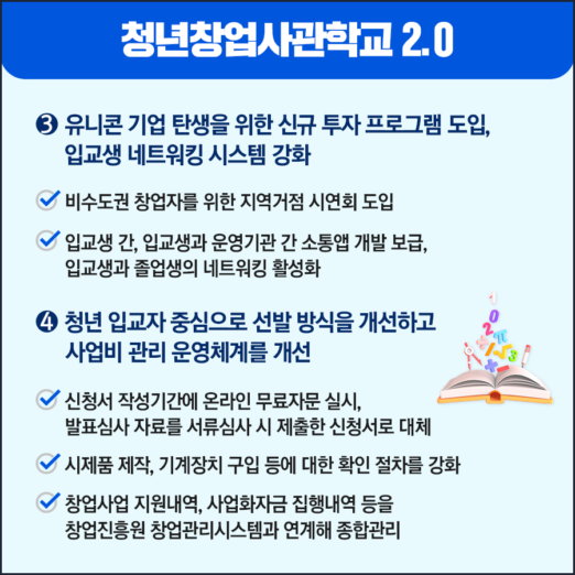 입교 희망자의 지원부담을 완화하기 위해 신청서(사업계획서) 작성기간에 온라인 무료자문을 실시하고, 발표심사 자료를 별도 피피티(PPT)가 아닌 서류심사시 제출한 신청서로 대체한다. 사업비 관리강화를 위해서는 시제품 제작, 기계장치 구입 등에 대한 확인 절차를 강화하고, 창업사업 지원내역, 사업화자금 집행내역 등을 창업진흥원 창업관리시스템과 연계해 창업사업 지원이력을 종합관리 할 계획이다.