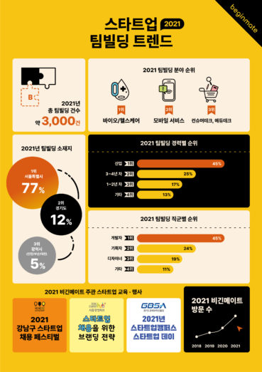 이러한 낮은 성공률에도 스타트업 팀빌딩 플랫폼 비긴메이트가 지난해 스타트업 팀빌딩 약 3,000건을 달성했다. 2020년도 대비 큰 폭으로 증가한 수치로 월평균 247개의 팀빌딩 공고가 등록되었으며, 팀빌딩 사업 분야는 ▲바이오 및 헬스케어 ▲모바일 서비스 ▲컨슈머테크 ▲에듀테크가 주를 이뤘다.