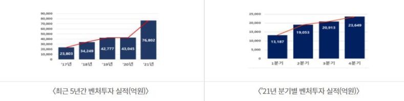중소벤처기업부(장관 권칠승, 이하 중기부)는 ’21년도 벤처투자 실적을 분석한 결과 ’21년도 벤처투자가 종전 역대 최대실적이었던 ’20년 투자실적(4조 3,045억원)을 약 3.4조원 경신한 7조 6,802억원으로 역대 최대치를 기록했다고 밝혔다.