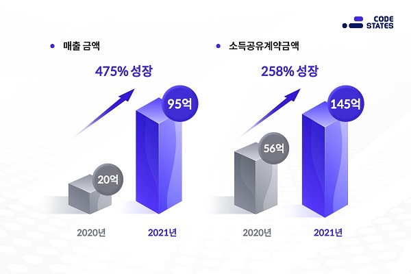 국내 대표 IT 인재양성 스타트업 코드스테이츠의 2021년 매출액이 전년대비 475% 이상 큰 폭으로 성장했다.