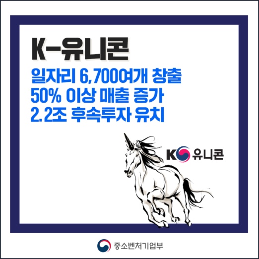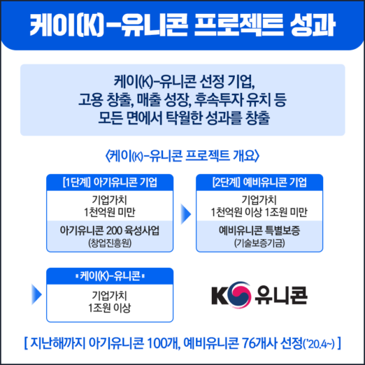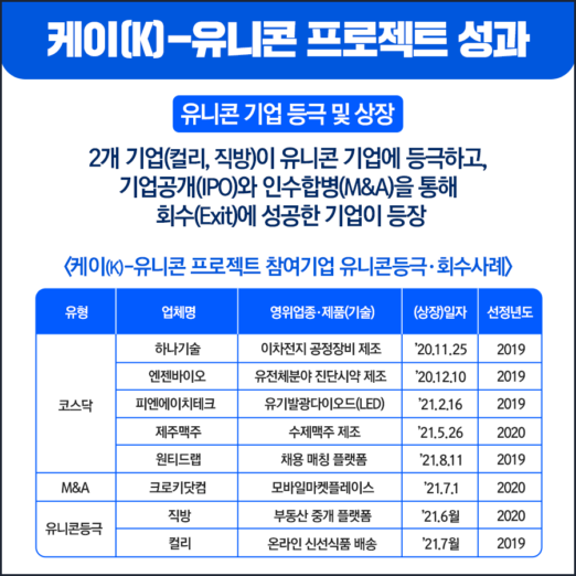 중소벤처기업부(장관 권칠승, 이하 중기부)는 케이(K)-유니콘 프로젝트 참여기업들의 성과를 발표했다. 케이(K)-유니콘 프로젝트는 투자유치 등 시장검증을 거친 유망 창업·벤처기업이 유니콘기업까지 성장할 수 있도록 돕는 정부 사업으로 ’20년 4월 이후 본격 추진되고 있다.