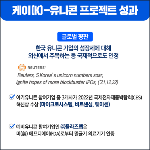 그밖에도 아기유니콘 참여기업 중 3개사(마이크로시스템, 비트센싱, 웨이센)가 2022년 국제전자제품박람회(CES) 혁신상을 수상하고, 예비유니콘 참여기업인 ㈜플라즈맵은 미(美) 에프디에이(FDA)로부터 멸균기 의료기기 인증을 받았다. 한국 유니콘기업의 성장세에 대해 영(英) 로이터통신에서 주목하는 등 케이(K)-유니콘 프로젝트 참여기업들이 국제적으로도 인정받고 있다.