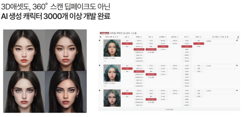 반면 네오엔터디엑스의 제작 방식은 AI로 무에서 유를 창조하는 형태다. 즉, 3D 모델링이 없어도, 실존인물을 360도 스캔하지 않아도 가상 얼굴을 만드는 독자적인 기술을 보유하고 있다는 것. AI가 캐릭터의 이미지를 생성할 뿐 아니라, 캐릭터의 다양한 얼굴 각도 및 표정에 따른 이미지를 모두 생성하는 것이 핵심이다.