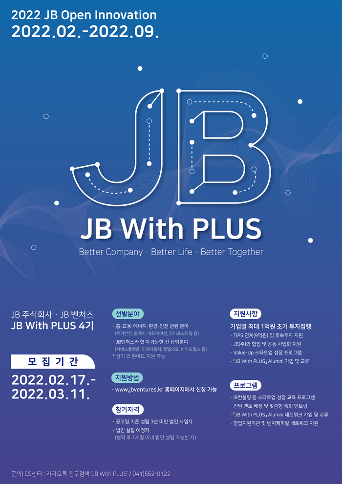 JB주식회사(대표이사 한권희)는 오픈이노베이션 프로그램 ‘JB With PLUS’ 4기를 2월 17일부터 3월 11일까지 모집한다고 밝혔다.