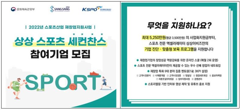 스포츠 전문 액셀러레이터 ㈜상상이비즈에서 2022년 상상 스포츠 세컨찬스(스포츠 재창업지원) 참여기업을 모집한다.