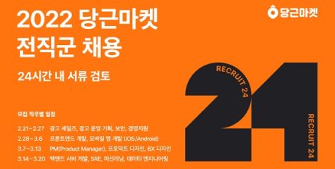 당근마켓이 2022년 1분기에도 각 분야 전문 인력들을 대거 영입하며 서비스 고도화와 사업 확장 채비에 나선다. 국내 대표 지역생활 커뮤니티 당근마켓(공동대표 김용현, 김재현)은 인재 영입을 위한 전직군 채용 캠페인 ‘RECRUIT24(이하 리크루트24)’를 실시한다고 22일 밝혔다. 이번 채용 캠페인의 핵심은 ‘간편지원’이다. 지원자의 이력서 준비에 대한 부담을 줄이기 위해 서류전형을 간소화하고, 지원자가 제출한 핵심 내용을 토대로 포지션 적합성을 평가하여 지원 24시간 이내에 서류 결과를 안내하는 방식이다. 서류 지원양식은 설문지 형태로 복잡한 절차 없이 핵심만 간략하게 작성하여 제출할 수 있도록 구성된다. 자기소개서 등의 항목은 과감히 배제됐다. 지원자는 당근마켓 채용페이지에서 본인이 지원하고자 하는 포지션 혹은 상단의 '리크루트24' 배너를 클릭하여 간편지원 양식을 확인할 수 있다. 또 핵심 역량과 프로젝트 성과 기술을 통해 지원 포지션에서 활용할 수 있는 능력과 경험을 강조하면 된다. 당근마켓 서비스에 관심이 많고 성장에 대한 열정과 역량을 가진 인재라면 누구든 지원할 수 있다. 리크루트24는 4주간 매주 특정 포지션을 릴레이 채용하는 형식으로 진행된다. 1주 차에는 ▲광고 세일즈/운영 기획 ▲보안 ▲경영지원 직군에 지원할 수 있다. 이어 2주 차에는 ▲프론트엔드 ▲모바일앱(Android, iOS) 개발, 3주 차에는 ▲PM(프로덕트 매니저) ▲프로덕트 디자인 ▲ BX 디자인 직군 채용이 이뤄진다. 마지막 4주 차에는 ▲백엔드 서버 개발 ▲SRE(사이트 신뢰성 엔지니어) ▲머신러닝 ▲데이터 엔지니어링 직군의 서류 접수가 진행된다. 당근마켓은 이번 리크루트24 캠페인을 포함하여 1분기 내 100명 채용을 목표로 하고 있다. 이번 캠페인에서는 ‘동료추천 프로모션'도 실시된다. 지원자가 추천한 인재와 함께 지원하여 합격하는 경우 특별 인센티브를 지급하는 방식이다. 지원자 누구나 같은 회사에서 근무 경험이 있는 인재를 추천할 수 있으며, 지원자와 피추천인이 당근마켓에 최종 입사할 경우 두 사람 모두에게 인센티브가 지급된다. 추천인 수에는 제한이 없다. ‘동료추천 프로모션'은 당근마켓과 좋은 인재들의 연결이 이어지고 확장되는데 고마움의 표현으로 기획됐다. 당근마켓 피플팀 강구열 팀장은 “당근마켓이 폭발적인 성장을 이어올 수 있었던 것은 뛰어난 역량과 열정을 기반으로 서로 시너지 효과를 내며 노력해온 구성원들이 있었기 때문"이라며, “최고의 동료들과 함께 2200만 명 규모의 국내 최대 하이퍼로컬 서비스 혁신을 주도해 나가며 큰 성장을 이루고 싶은 인재들의 많은 관심과 지원을 바란다”라고 전했다. 한편 구직자들 사이에서 ‘입사하고 싶은 기업’으로 손꼽히고 있는 당근마켓은 ▲유연한 조직 문화 ▲뛰어난 동료들과 함께 성장할 수 있는 업무 환경 ▲업계 최고 수준의 보상 수준 등 인재에 대한 적극적인 투자로 구성원들의 만족도가 높은 회사로 알려져 있다. 지난해에는 첫 전직군 대규모 채용 캠페인 ‘+100 members’를 실시, 구직자들의 많은 관심과 지원을 받은 바 있다. 관련기사더보기 https://www.venturesquare.net/848796