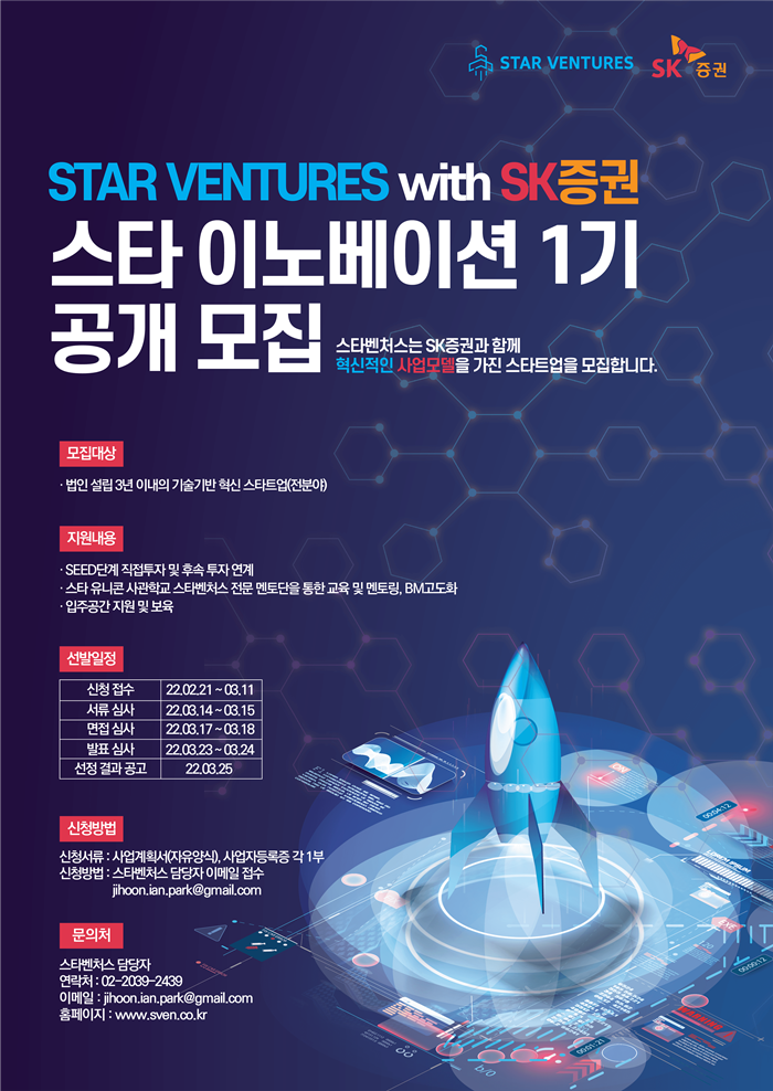 유니콘 사관학교 ‘스타벤처스'(대표 문지은)가 SK증권과 함께 차세대 기술기반 유니콘 창업기업을 발굴, 육성하기 위한 유니콘 액셀러레이터 프로그램 ‘스타 이노베이션’에 참가할 1기 스타트업을 공개 모집한다고 22일 밝혔다.