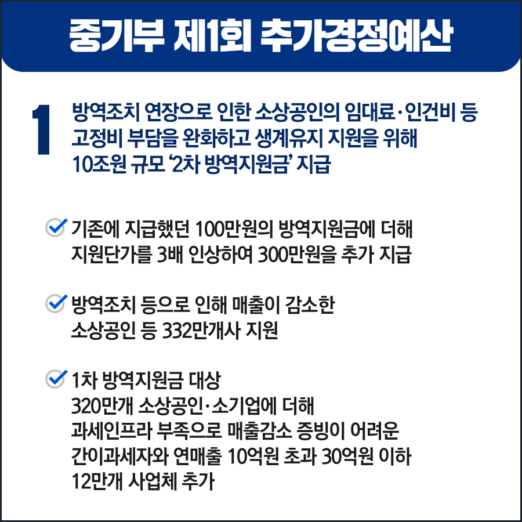 고강도의 방역조치가 연장됨에 따라 발생한 소상공인의 피해를 지원하기 위해 기존에 지급했던 100만원의 방역지원금에 더해 지원단가를 3배 인상하여 300만원을 추가 지급한다.