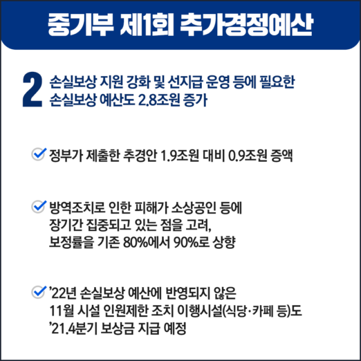 - 둘째, 손실보상 지원 강화 및 선지급 운영 등에 필요한 손실보상 예산도 2.8조원 증가했다.