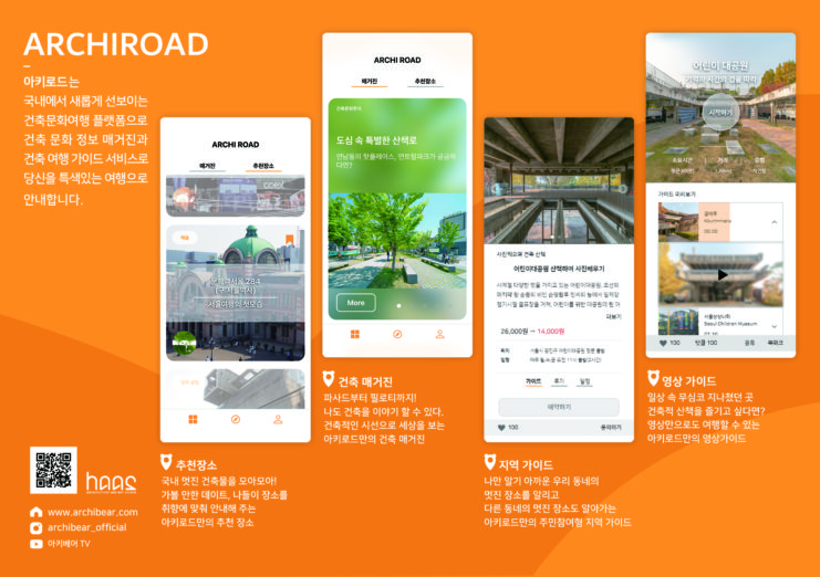 “우리가 가지고 있는 서비스의 특장점은 건축 또는 관련학과를 전공하고 공부한 팀원들이 모여 직접 선별한 건축물 데이터 베이스를 기반으로 시나리오, 촬영, 편집, 디자인 전반적인 작업을 거쳐 직접 콘텐츠를 만드는 데에 있습니다. 건축을 안다는 것이 더 이상 어려운 것이 아니라는 것. 알고 보면 재미있고 유익한 여행이 될 수 있다는 점을 어필하기 위해 새로운 시각을 부여하고 대중적인 콘텐츠를 만들기 위해 노력하는 것이죠. 일상 속에서 볼 수 있는 가까운 곳들의 공간 뿐 아니라 여행에서 만나는 공간들까지, 고객들에게 일상 속 소소한 행복을 주는 서비스를 제공할 수 있도록 그 방법을 찾고 함께 성장하고 있습니다.”