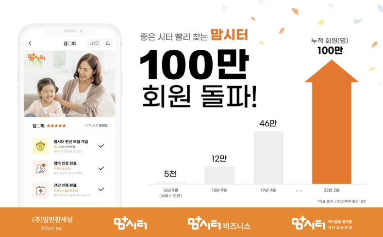 아이돌봄 연결 플랫폼 ‘맘시터’의 누적 회원수가 100만 명을 돌파했다. 2018년 이용자 수 12만 명 달성 이후 회원수가 3년 만에 약 10배 성장한 것으로 아이돌봄 업계 최초 100만 회원을 보유한 1위 서비스로 자리를 굳건히 했다.