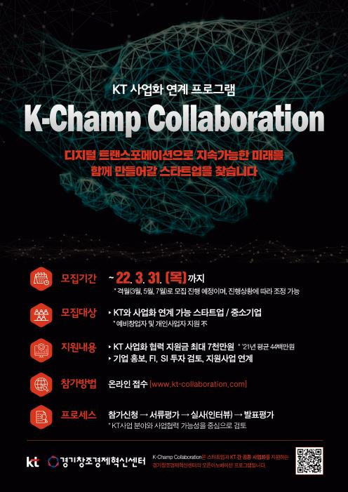 K-챔프 콜라보레이션은 경기혁신센터, KT가 공동 주관하는 오픈 이노베이션 프로그램이다. 2016년부터 지금까지 ▲KT-스타트업 간 공동 사업화 프로젝트 총 97건 지원 ▲발굴 기업 총 누적 매출액 5905억원 이상 달성 ▲매년 참가 기업에 대한 투자 집행 등 실질적 협력이 이뤄지고 있다.