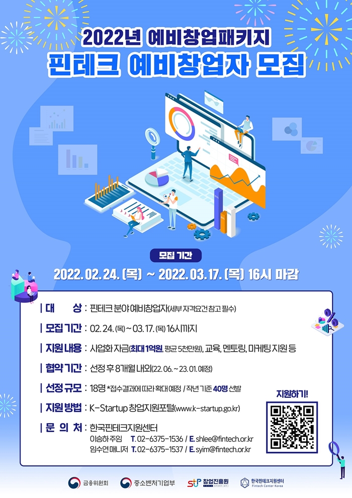사단법인 한국핀테크지원센터(이사장 변영한)은 ‘2022년 예비창업패키지 핀테크 분야’ 예비창업자를 모집한다고 8일 밝혔다.