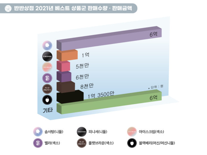 2021년 4월에 런칭한 ‘반반상점’은 2021년 누적 매출액은 12억, 누적 회원 수 1만 명의 뷰티샵 운영자를 모집했다. 해당 매출액은 반반상점이 국내 최고의 반영구화장 아티스트들과 1년동안 협업하여 만든 제품 브랜드들이 주요 매출원이다. 반영구화장 니들 브랜드 중 솜사탕은 2021년 국내 최다 판매량을 기록하였으며 누적 판매량은 150만 개에 이른다.