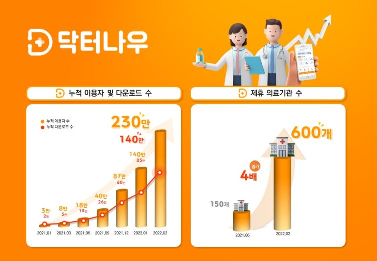 2월 닥터나우 데이터에 따르면 한달 간(2022.02.01~2022.02.28) 이용자 수 약 90만 명, 앱 다운로드는 약 60만 건을 기록했다. 비대면 진료·처방약 배송 서비스를 론칭한 2020년 12월 이래로 누적 이용자 수는 230만, 누적 앱 다운로드는 140만 건을 넘었다.