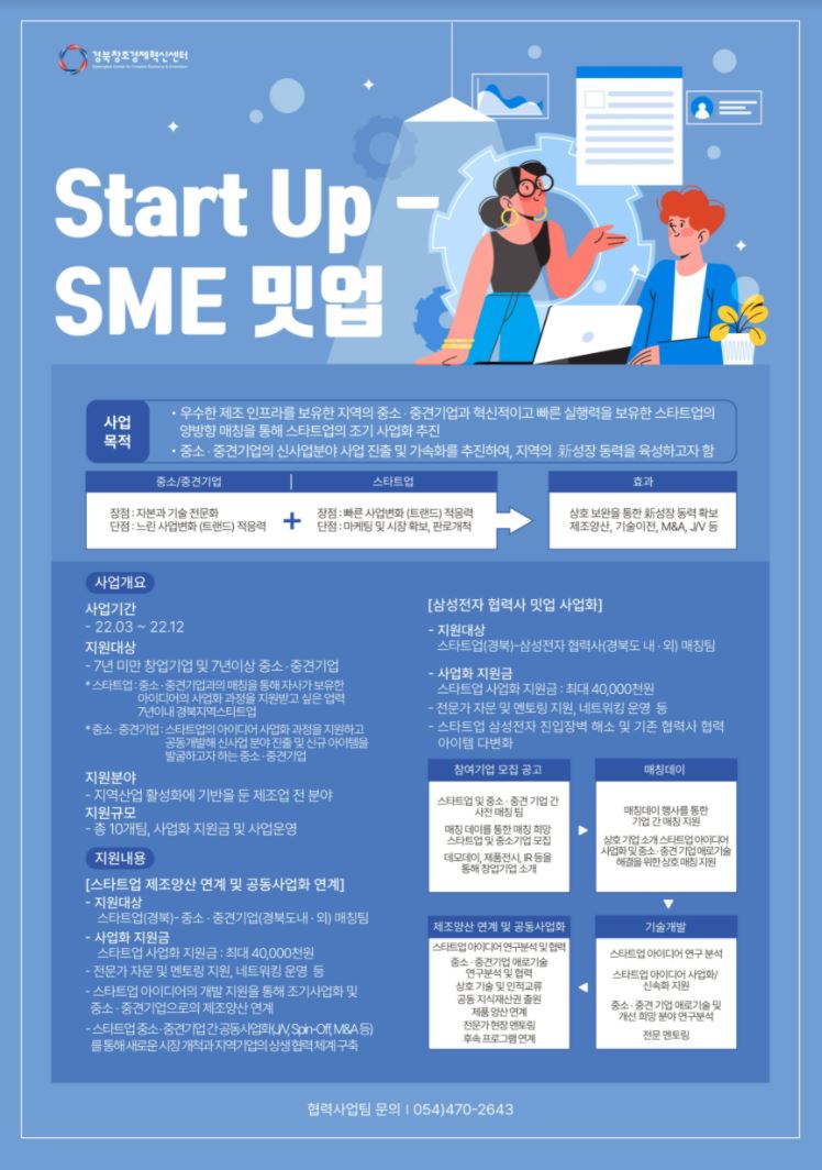 경북창조경제혁신센터(센터장 이경식)는 경상북도의 지원으로‘2022년 스타트업-중소기업 밋업(Meet-Up) 프로그램’을 추진한다고 밝혔다.