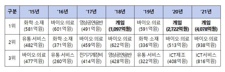 ’21년 게임 업종 기업들이 4,078억원으로 평균 기업가치가 가장 높았고, 바이오·의료 938억원, ICT서비스 816억원 등이 뒤를 이었다.