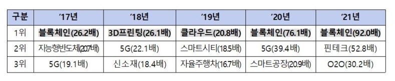 이러한 분석 결과는 블록체인 분야의 미래 활용과 발전 가능성, 플랫폼 산업의 활황 등 최근 트렌드가 반영된 영향으로 풀이된다.