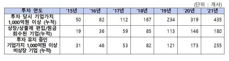 - 전체 = 기업가치 1,000억원 이상 기업은 435개사, 투자유지 중인 기업은 255개사