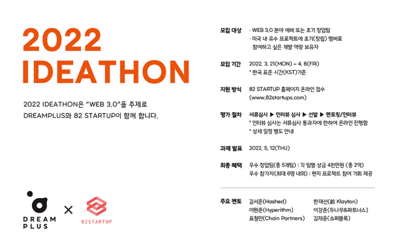 한화생명 드림플러스와 82 STARTUP이 지난 3월 21일부터 ‘WEB 3.0’을 주제로 한 ‘2022 IDEATHON’의 참가자를 모집한다. 2022 아이디어톤은 본격적인 WEB 3.0 시대를 맞아 우수한 기술력을 갖춘 창업팀과 인재들을 발굴하여 성장을 지원하겠다는 취지로 기획 됐다.