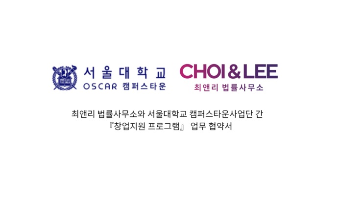 스타트업 및 중소기업 전문 로펌 ‘최앤리(대표 최철민)’가 서울대학교 캠퍼스타운(단장 김태완)과 초기 스타트업 지원을 위한 양해 각서를 체결했다고 31일 밝혔다.