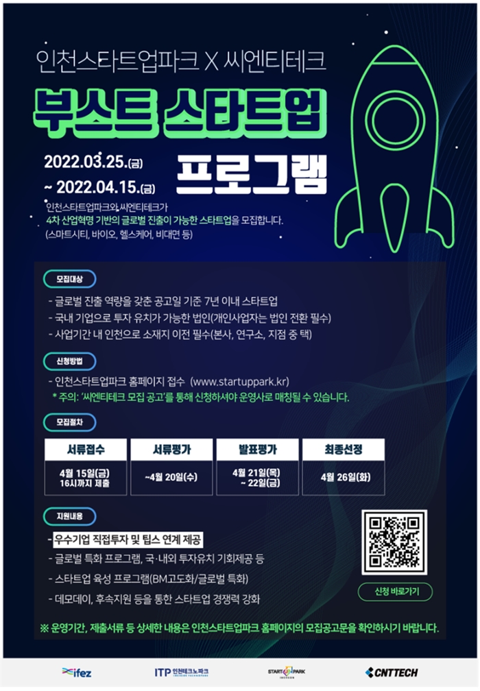 인천경제자유구역청(청장 이원재)과 인천테크노파크(원장 서병조)가 주관하는 인천스타트업 파크 2022년 부스트 스타트업(Boost Startup) 프로그램 운영사로 선정된 투자 전문 액셀러레이터이자 팁스(TIPS) 운영사인 씨엔티테크(주)(대표 전화성, CNT테크)가 설립 7년 이내의 참여기업을 내달 15일까지 모집한다고 밝혔다.