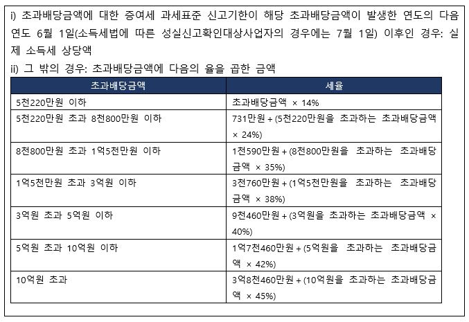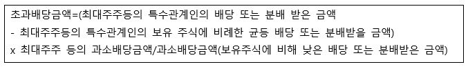 2020년 12월 31일 이전 증여분에 대해서는 초과배당금액에 대한 소득세와 증여세 중 큰 금액을 과세하였으나, 2021년 1월 1일 이후 증여를 받는 분부터는 초과배당금액에 대한 소득세와 증여세를 함께 부과하되 증여재산가액 산정시 소득세 상당액을 차감하도록 하였다. 초과배당금액에 대한 계산식은 다음과 같다.