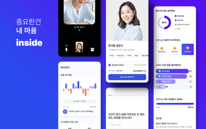 오웰헬스는 서울대학교 의과대학 출신 창업자와 네이버 출신 개발 및 프로덕트 리드에 의해 설립된 기업이다. 오웰헬스가 운영하는 멘탈헬스케어 서비스 ‘인사이드’는 감정기록을 바탕으로 한 정신건강 분석과 비대면 심리상담을 제공하는 애플리케이션(앱)이다. 인사이드는 다가오는 5월부터 본격적으로 비대면 상담 기능을 출시할 계획이다. 이후 상반기 내에 그룹상담, 정신건강 커뮤니티, 디지털 인지행동치료(CBT: Cognitive Behavioral Therapy) 등 다양한 솔루션들을 추가하며 단순 중개가 아닌 헬스케어 서비스로서의 입지를 공고히 할 예정이다.