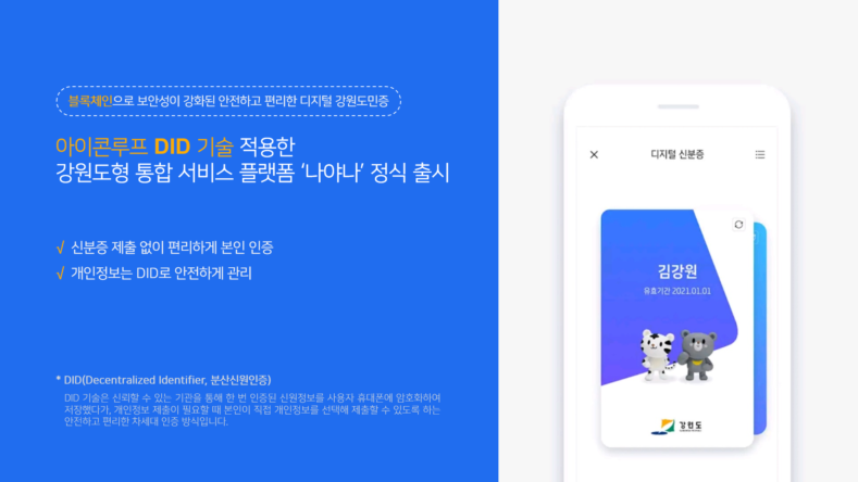 국내 대표 블록체인 기업 ㈜아이콘루프(ICONLOOP, 대표 김종협)는 자사 DID(Decentralized Identifier) 기술을 적용한 강원도형 통합 서비스 플랫폼 ‘나야나’가 정식 출시되었다고 밝혔다.