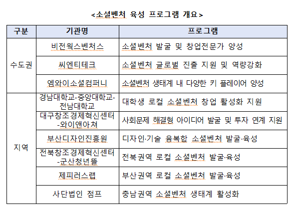 중기부는 운영기관이 중심이 되는 네트워크를 구축하고 전국에서 우수한 (예비)소셜벤처가 발굴되고 다양한 사회적문제가 해결될 수 있도록 지원할 계획이다.