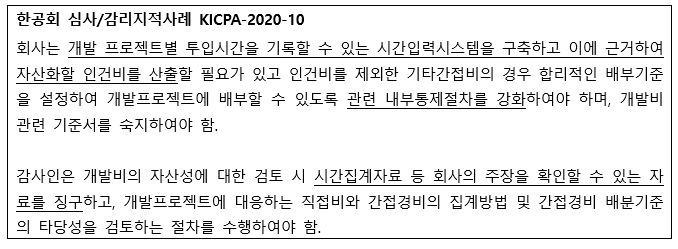 아래 ‘감리지적사례’는 감독당국이 회계법인이 개발비와 관련하여 수행한 감사 업무에 대한 리뷰 후 적절치 않았던 절차를 지적한 것이다. 이를 통해 당국이 개발비에 대해 원하는 입증 수준을 엿볼 수 있다.