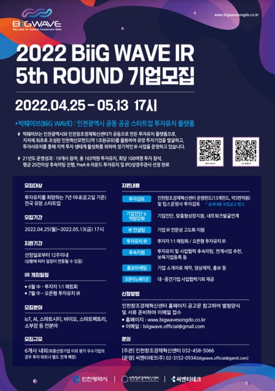 인천광역시(시장 박남춘)가 주최하고 인천창조경제혁신센터(센터장 김석준)이 주관하는 빅웨이브 IR(투자유치 사업계획서 발표회)가 참가기업을 모집한다.