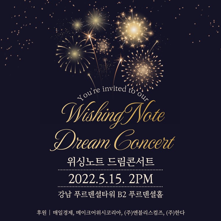 본 콘서트는 매일경제, 메이크어위시 코리아(Make-A-Wish, Korea), (주)엔블리스컴즈, (주)한다가 후원하여 수익금 전액을 메이크어위시 코리아에 기부한다. 메이크어위시 코리아는 난치병 아동들의 소원을 이루어주는 세계최대 소원성취 기관으로 기부된 금액은 난치병 아이들에게 삶의 희망과 용기를 전달하는 데 쓰일 예정이다.