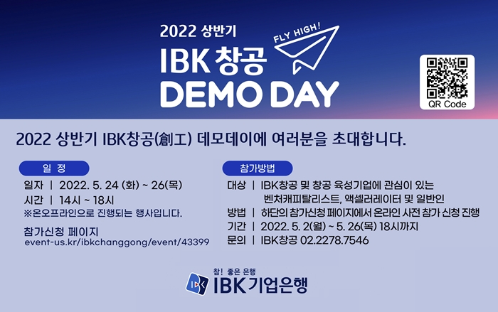 IBK기업은행(은행장 윤종원)은 오는 24일부터 3일 동안 서울 을지로 IBK파이낸스타워에서 창업육성 플랫폼 ‘IBK창공(創工)’의 2022년 상반기 데모데이를 개최한다고 밝혔다.