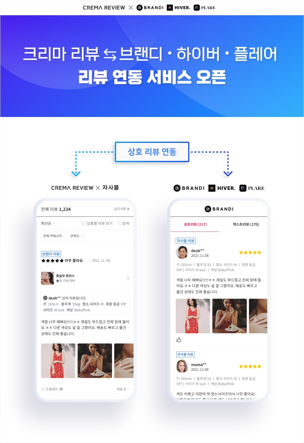이번 제휴를 통해 패션 쇼핑앱 ‘브랜디’, 남자 쇼핑앱 ‘하이버’, 30대 패션 쇼핑앱 ‘플레어’에 입점한 온라인 쇼핑몰들은 자사몰에서 수집한 리뷰를 입점 플랫폼에, 입점 플랫폼에서 수집한 리뷰를 자사몰에 노출할 수 있게 됐다. 소비자들은 어느 채널에서 쇼핑하든 한곳에서 모든 리뷰를 확인할 수 있어 더욱 풍성한 정보와 함께 쇼핑 가능하다.