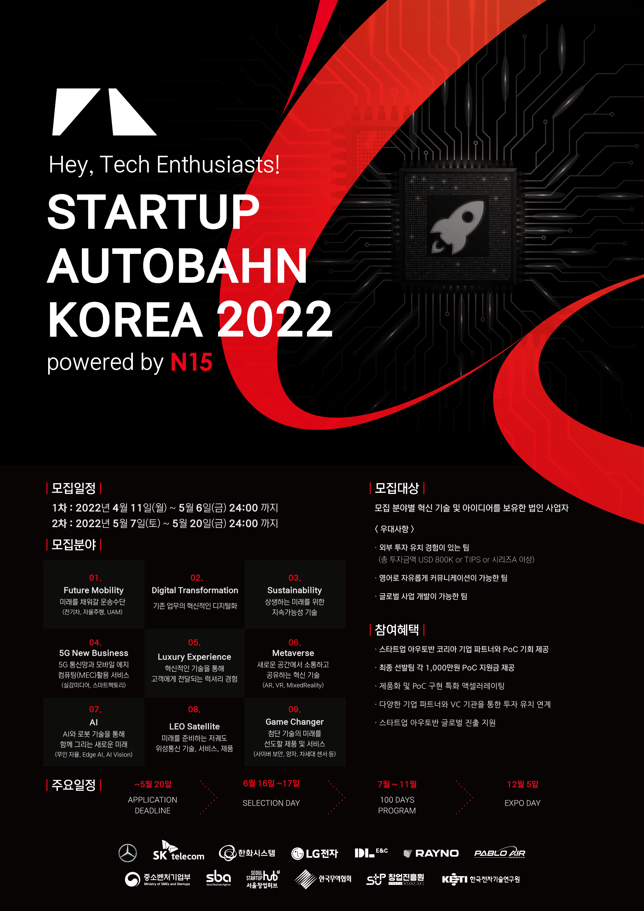 메르세데스-벤츠 코리아가 주관하고 N15이 운영하는 메르세데스-벤츠 그룹 AG의 스타트업 육성 플랫폼인 ‘스타트업 아우토반 코리아(STARTUP AUTOBAHN KOREA)’가 모집 분야와 규모를 확대해 세번째 국내 개최를 알렸다.