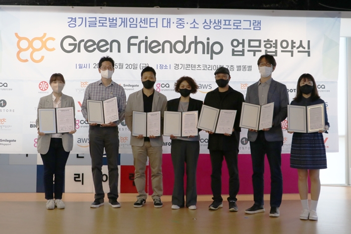 경기콘텐츠진흥원(원장 민세희, 이하 경콘진)은 중·대형 게임사 및 게임 서비스사 6개사와 게임 산업계의 대·중·소 상생 무드 조성을 위한 ‘GGC Green Friendship 업무협약’을 지난 20일 체결했다.