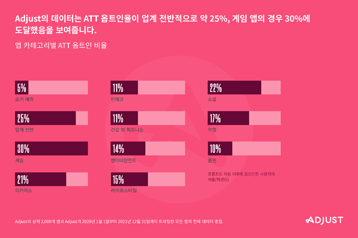 2021년 4월 Apple의 iOS 14.5와 AppTrackingTransparency(ATT) 프레임워크 도입 이후 모바일 마케팅 산업은 기존의 사용자 개인정보 관리 및 추적 방법을 재고해야 했다. 당시 사용자의 옵트인(동의) 비율이 최저 5%일 것이라는 전망이 나왔으나, 애드저스트(Adjust)의 최신 데이터에 따르면 평균 옵트인율은 25%이며(2021년 5월 기준 16%), 게임 카테고리의 경우 30%에 이르는 것으로 나타났다.